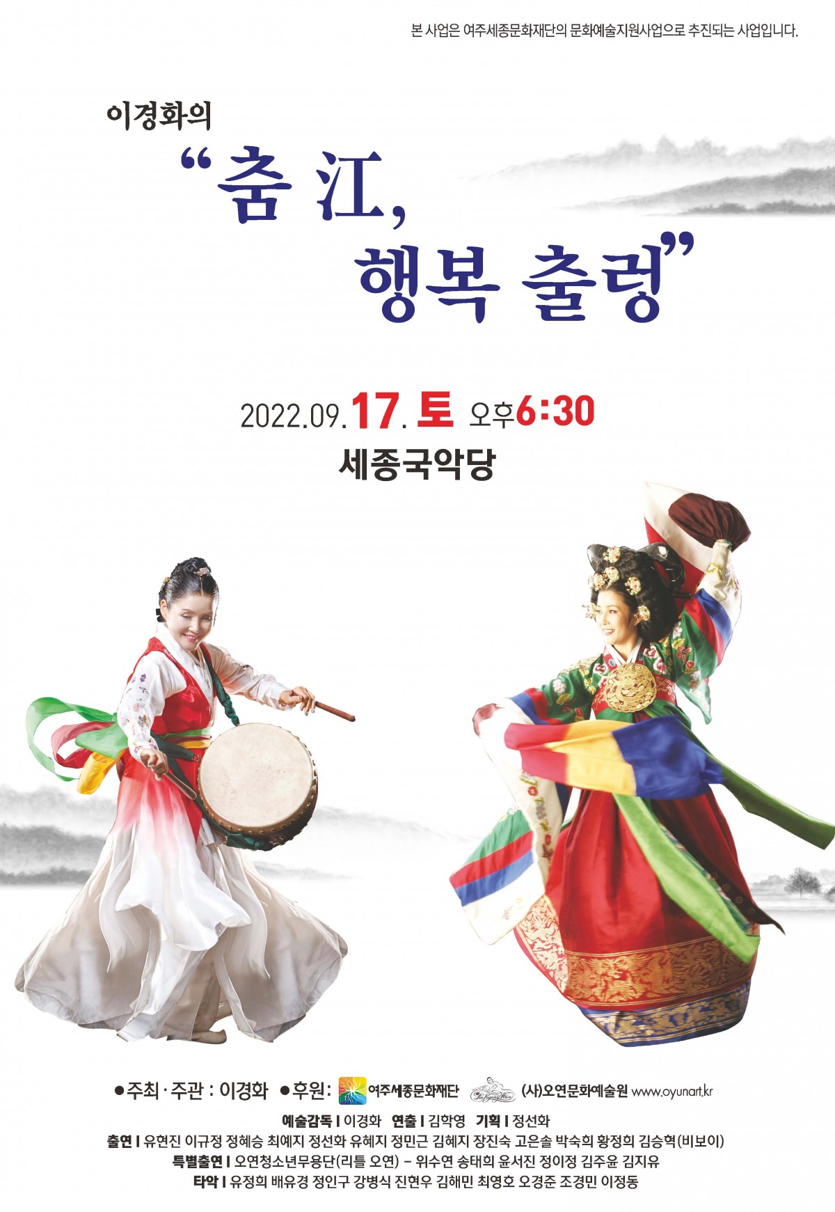 9월17일 토. 세종국악당. 오후6시30분 - 이경화의 춤 강, 행복출렁 페이지 정보 작성자관리자 댓글 0건 조회 920회 작성일 22-09-06 21:02 본문 여주시민과 함께 하는 이경화의“춤 江, 행복 출렁”2022년 9월 17일, 토, 오후6시30분, 세종국악당-공연 목록 다음글2022년 무용전공자 및 지도자를 위한 진도북춤 워크샵<7월 27일(수)~28일(목)> 22.07.04 댓글목록 댓글목록 등록된 댓글이 없습니다.